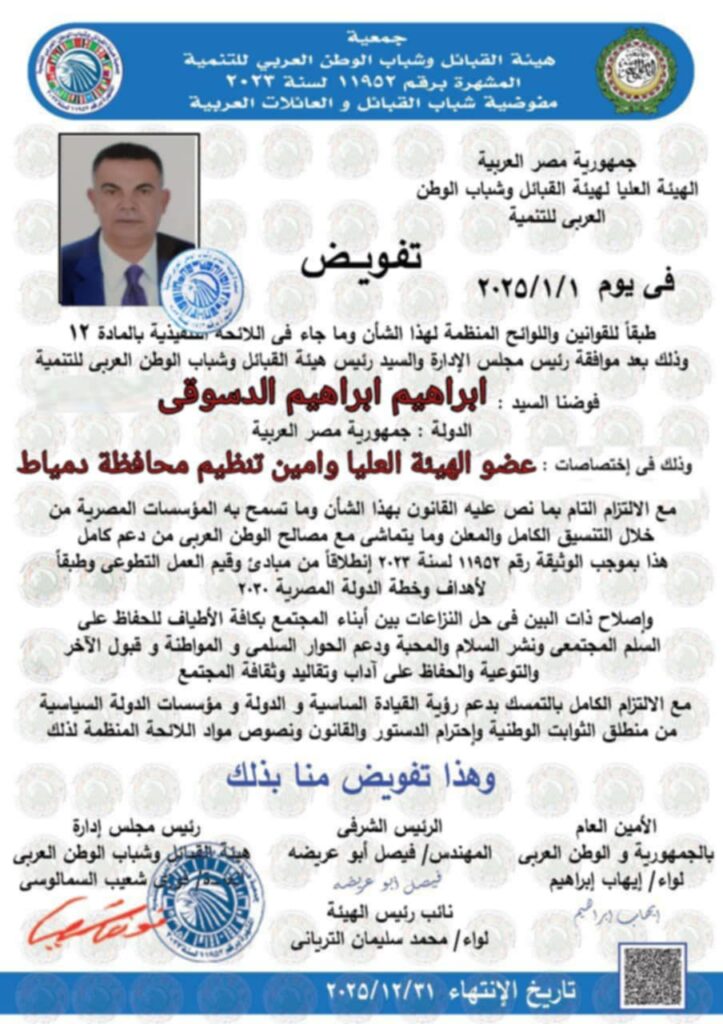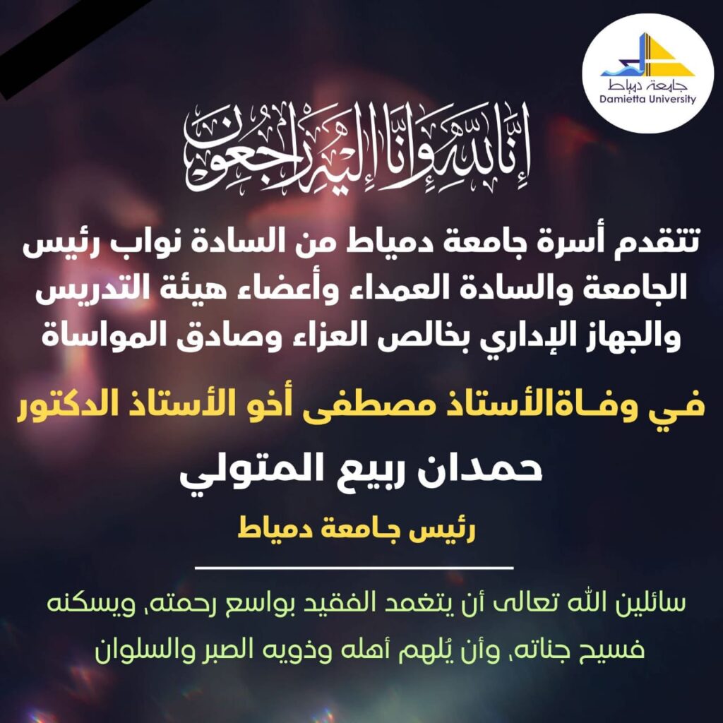 تقدّم الأستاذ إبراهيم الدسوقي غضون، عضو الهيئة العليا وأمين تنظيم محافظة دمياط للهيئة العليا لهيئة القبائل وشباب الوطن العربي للتنمية، بخالص العزاء وصادق المواساة في وفاة الأستاذ مصطفى، شقيق الأستاذ الدكتور حمدان ربيع المتولي رئيس جامعة دمياط.