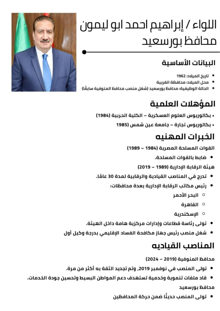 • الحالة الوظيفية: محافظ بورسعيد (شغل منصب محافظ المنوفية سابقًا)