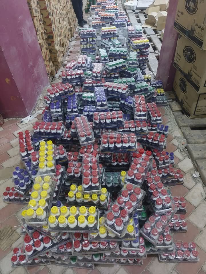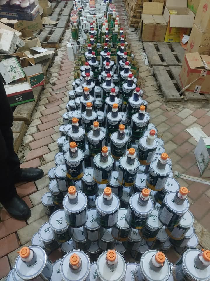 والمضبوطات ٤٤٧٠ عبوة دهانات لاكيه وعبوات ألوان بلاستيكية ودهان رخامى وطلاء لامع جميعها منتهية الصلاحية