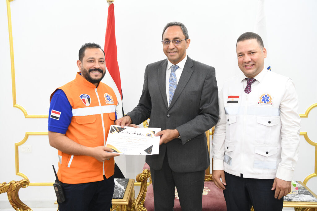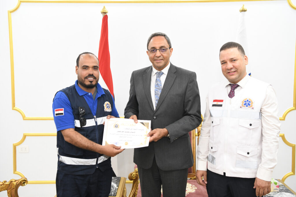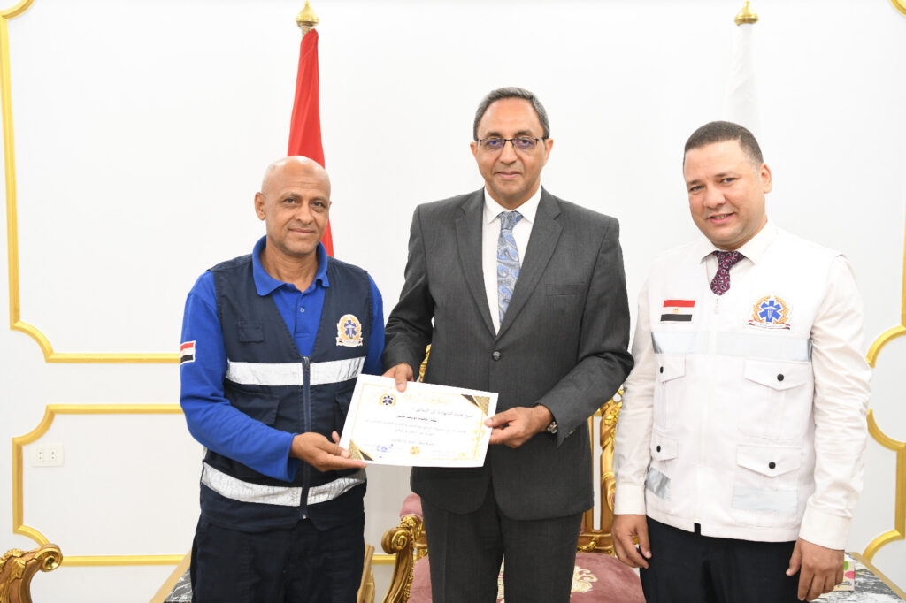 كرم الدكتور خالد عبدالحليم محافظ قنا، اليوم المسعف الشاذلي محمد أحمد وفني القيادة عمار محمد يوسف والمشرف العام محمد أحمد إبراهيم تقديرا لدورهم البطولي في إنقاذ حياة سيدة أثناء ولادة طارئة داخل عربة الاسعاف بمنطقة العقب التابعة لقرية خزام بمركز قوص