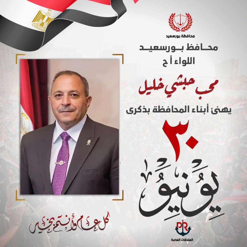 تقدم اللواء أ ح / محب حبشي، محافظ بورسعيد بخالص التهنئة إلى أبناء محافظة بورسعيد، بمناسبة حلول الذكرى الحادية عشرة لثورة 30 يونيو المجيدة، التي سطر فيها الشعب المصري واحدة من أعظم صور الوحدة الوطنية والإرادة الحرة.,