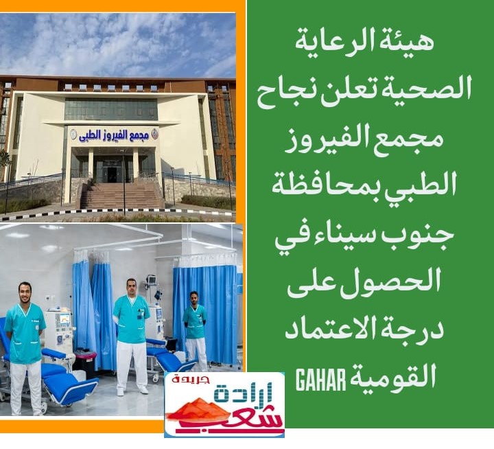 أعلنت الهيئة العامة للرعاية الصحية، برئاسة الدكتور احمد السبكي، رئيس مجلس ادارة الهيئة، عن نجاح مجمع الفيروز الطبي بمدينة الطور بمحافظة جنوب سيناء من الحصور على درجة الاعتماد القومية GAHAR، المعترف بها دوليًا من منظمة الاسكوا العالمية (ISQua).