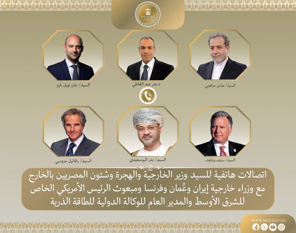 في إطار توجيهات السيد رئيس الجمهورية بتكثيف الاتصالات مع الأطراف الإقليمية والدولية لخفض التصعيد وتحقيق التهدئة في المنطقة ودعم الأمن والاستقرار بالشرق الأوسط، أجرى د. بدر عبد العاطي وزير الخارجية والهجرة مساء أمس ٤ يوليو وصباح اليوم ٥ يوليو سلسلة من الاتصالات مع السيد عباس عراقجي وزير الخارجية الإيراني، والسيد بدر بن حمد البوسعيدي وزير خارجية العُماني، والسيد جان نويل بارو وزير الخارجية الفرنسي، والسيد ستيف ويتكوف مبعوث الرئيس الأمريكي الخاص للشرق الأوسط، والسيد رافائيل جروسي المدير العام للوكالة الدولية للطاقة الذرية.,
