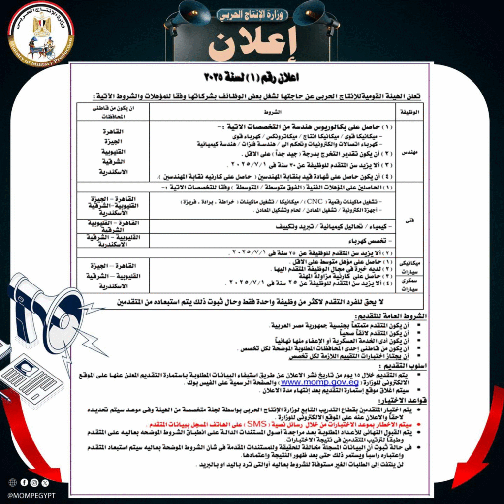 ***الرابط الخاص بإستمارة التقديم بإعلان الهيئة القومية للإنتاج الحربى رقم 1 لسنة 2025.