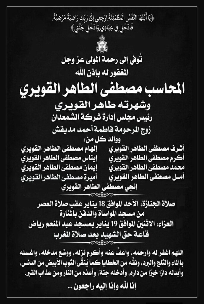 توفى منذ قليل رجل الأعمال السكندرى و رئيس مجلس إدارة شركة الشمعدان للصناعات الغذائية مصطفى الطاهر القويرى و المشهور ب [ طاهر القويرى ] .