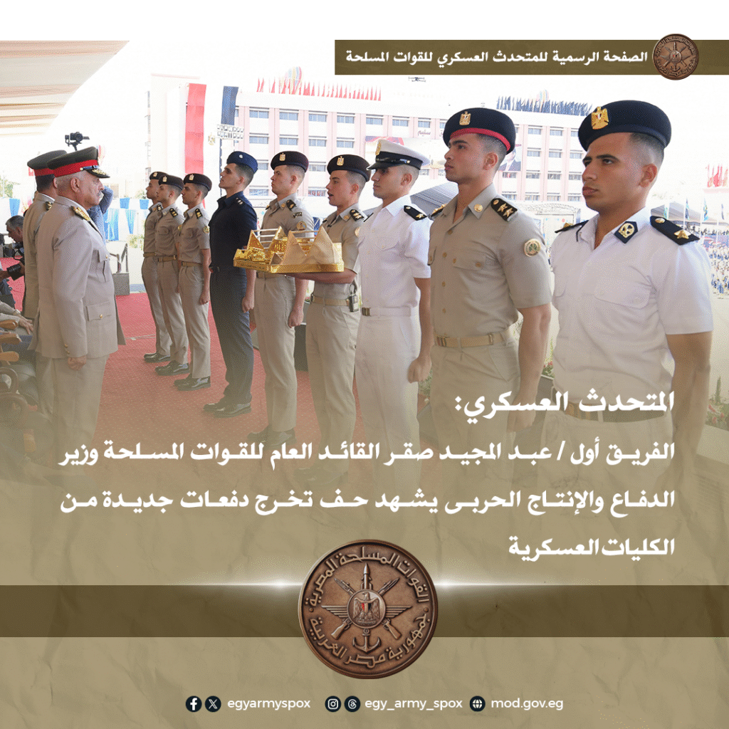 شهد الفريق أول / عبد المجيد صقر القائد العام للقوات المسلحة وزير الدفاع والإنتاج الحربى مراسم الإحتفال بتخريج دفعات جديدة من الكليات العسكرية ، الدفعة ( 76 ) بحرية دفعة الفريق / تامر عبد العليم محمـد والدفعة ( 62 ) فنية عسكرية دفعة الفريق فخرى / محمـد سعيد العصار والدفعة ( 8 ) كلية الطب بالقوات المسلحة دفعة اللواء طبيب / محمـد سعد الدين محمـد على عمر والدفعة ( 5 ) من حملة المؤهلات العليا والدورة ( 2 ) فروسية دفعة الفريق أول / صدقى صبحى والدفعة ( 4 ) ضباط متخصصين دفعة الفريق / إبراهيم عبد الغفور العرابى وذلك بحضور عدد من الوزراء والفريق / أحمد خليفة رئيس أركان حرب القوات المسلحة والفريق أول ركن / صدام حفتر نائب القائد العام للجيش الوطنى الليبى وعدد من المحافظين وقادة الأفرع الرئيسية وعدد من قادة القوات المسلحة والملحقين العسكريين ورؤساء الجامعات والشخصيات العامة والإعلاميين وأسر الخريجين .