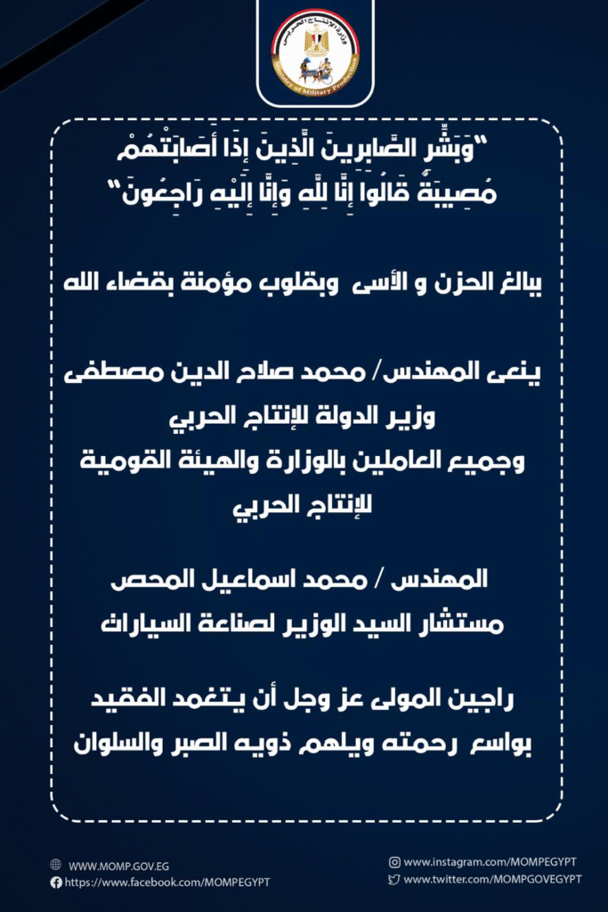 ينعى المهندس/ محمد صلاح الدين مصطفى وزير الدولة للإنتاج الحربي