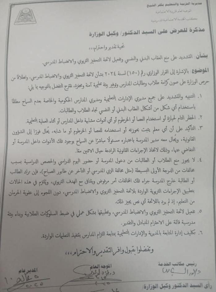 وجهت المديريات التعليمية على مستوى الجمهورية خطابًا عاجلًا إلى الإدارات والمدارس الحكومية والخاصة، شددت فيه على منع أي شكل من أشكال العقاب البدني أو النفسي للطلاب، مؤكدة أن التربية لا يمكن أن تُمارس بالعنف، وأن حماية الطلاب هي مسؤولية الجميع.