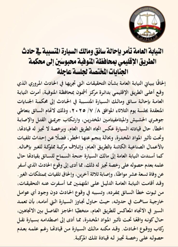 النيابة العامة تأمر بإحالة سائق ومالك السيارة المتسببة في حادث الطريق الإقليمي بمحافظة المنوفية والتي راح ضحيتها 19 فتاه وشاب سائق الميكروباص , إلى محكمة الجنايات المختصة لجلسة عاجلة.