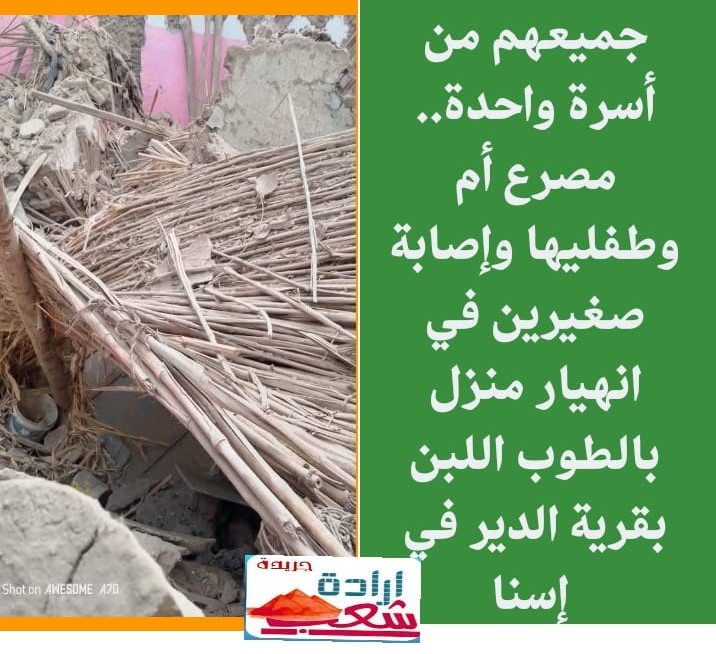 خيّم الحزن والأسى على أهالي قرية الدير شرق التابعة لمركز إسنا جنوب محافظة الأقصر، عقب حادث مأساوي وقع في الساعات الأولى من صباح اليوم، إثر انهيار منزل مبني بالطوب الأخضر، ما أسفر عن وفاة 3 أشخاص من أسرة واحدة وإصابة طفلين.