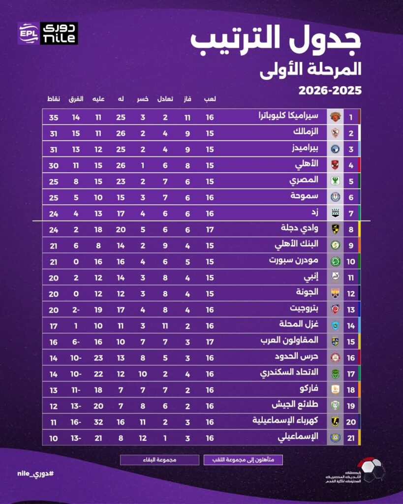 المنافسة على الصدارة حالياً تنحصر بين رباعى المقدمة ممن لديهم ٣٠ نقطة أو أكثر .