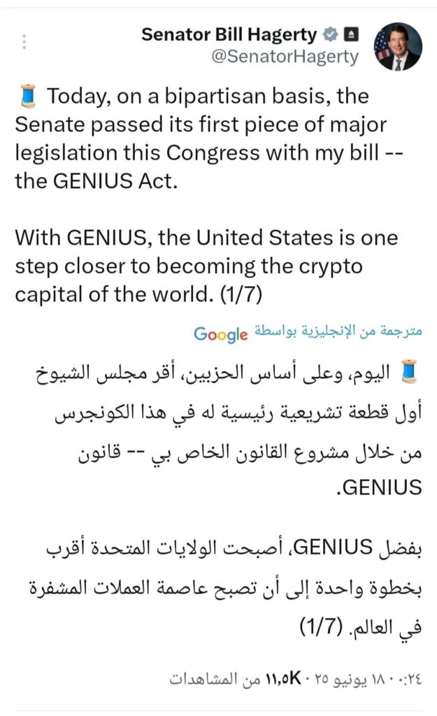 اليوم , وعلي اساس الحزبين , أفر مجلس الشيوخ أول قطعة تشريعية رئيسية له في هذا الكونجرس من خلال المشروع الخاص ب – قانون GENIUS , واضاف Bill بفضل هذا القانون . اصبحت الولايات المتحدة أقرب بخطواة واحدة الى أن تصبح عاصمة العملات المشفرة في العالم